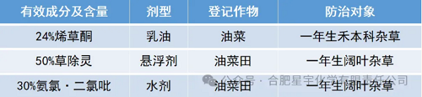 產品特點: ●正規登記油菜; ●內吸傳導性; ●四元組合,可防治一年生禾本科及闊葉雜草。
